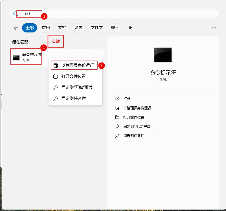 按“Win”键,弹出页面输入cmd,右键以管理员身份运行