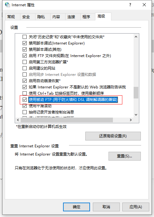 解决办法是,设置Internet Explorer 开启ftp被动模式。