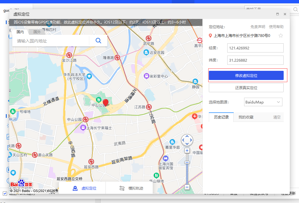 在弹出的虚拟定位窗口,拖动地址,将位置选者到上海。 然后点击“修改虚拟定位”完成定位