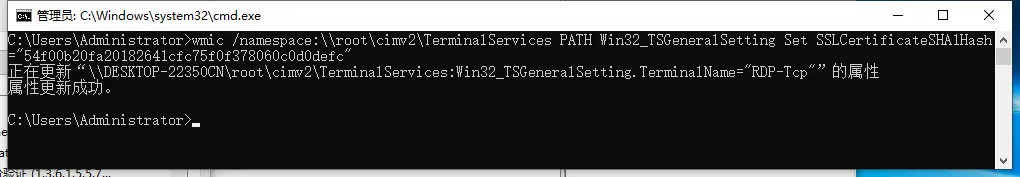 wmic /namespace:\\root\cimv2\TerminalServices PATH Win32_TSGeneralSetting Set SSLCertificateSHA1Hash="<刚才获得的Hash>"