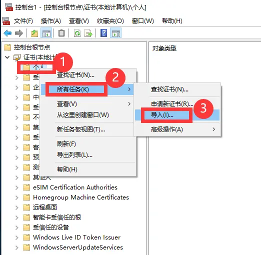 :: 第二步:将 .p12 导入到“计算机\个人\证书”(即本地计算机的“个人”存储)