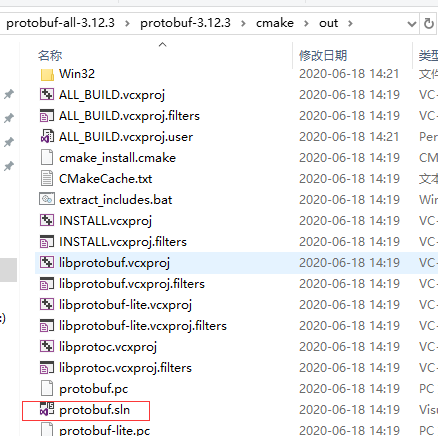 进入我们配置的out目录中,会看到一个ptotobuf.sln文件