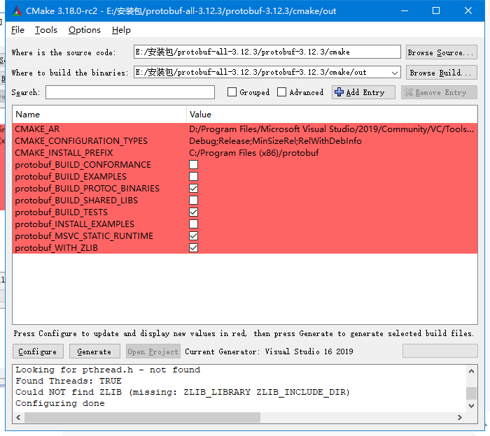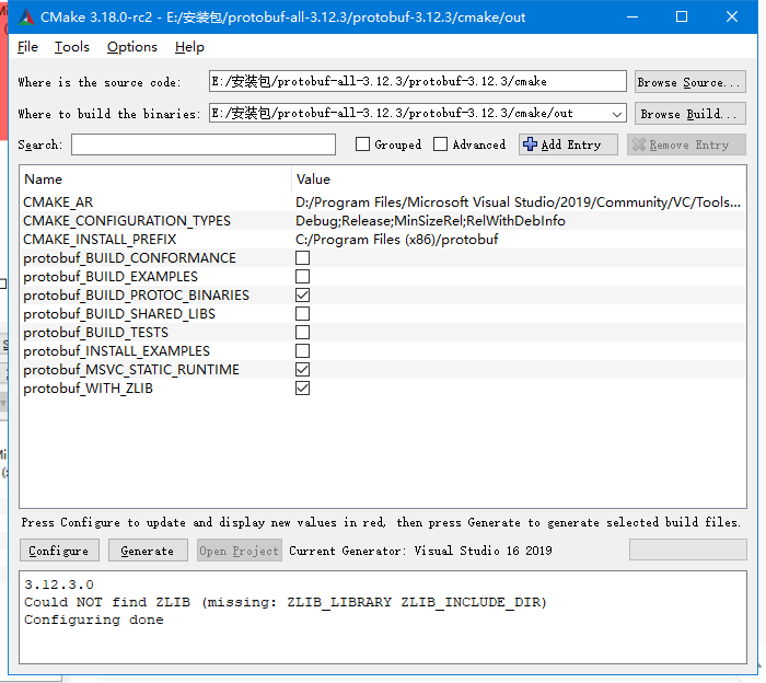 生成文件如果报错,将protobuf_BUILD_TESTS勾选去掉,这里没有安装gtest