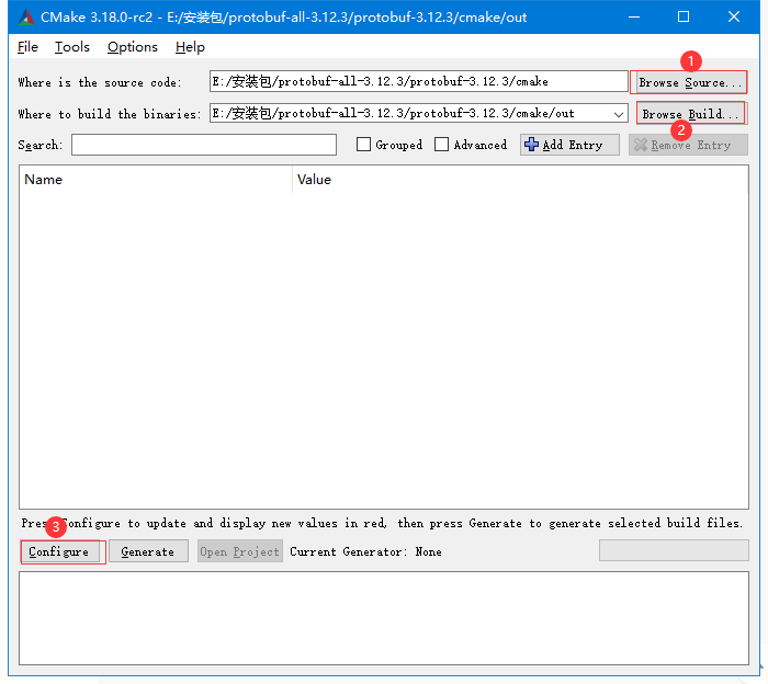 下载解压后,打开CMake,source code项填入protobuf的cmake目录,build the binaries项为成生的工程目录,这个自己填写一个就可以了。最后点Configure生成