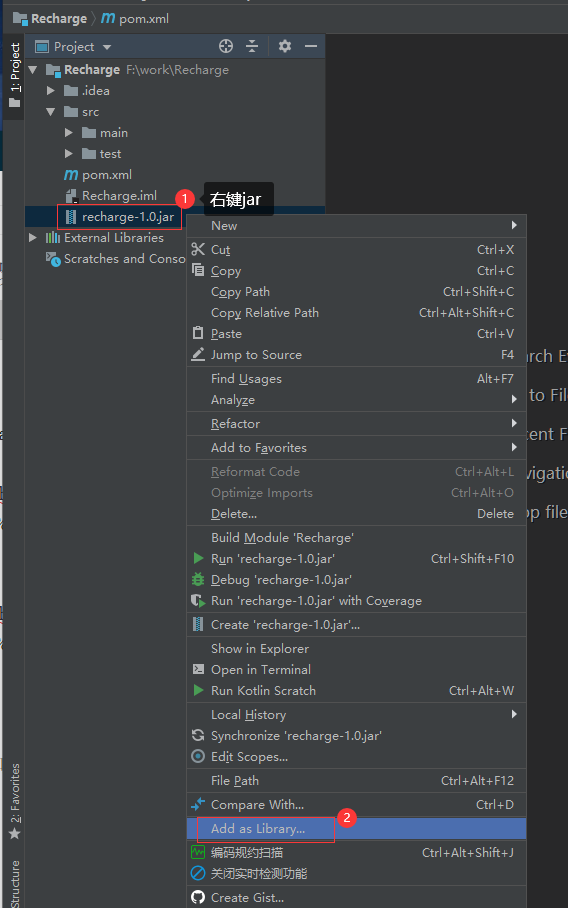 将recharge-1.0.jar包复制到项目中去,并添加jar到库