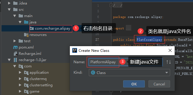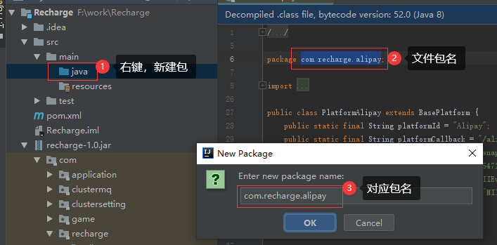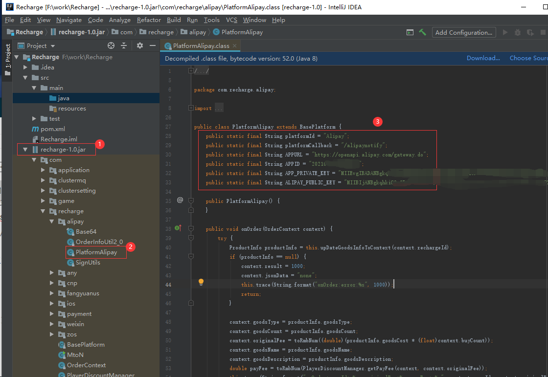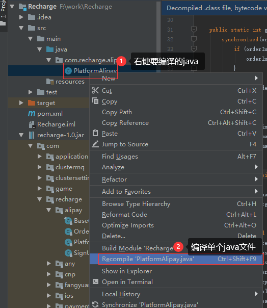 在工程左侧直接打开recharge-1.0.jar,找到要修改的代码(Intellij IDE可以直接反编译jar及内部的class),因为是自己以前写的,所以很快就能找到要改的代码在哪.