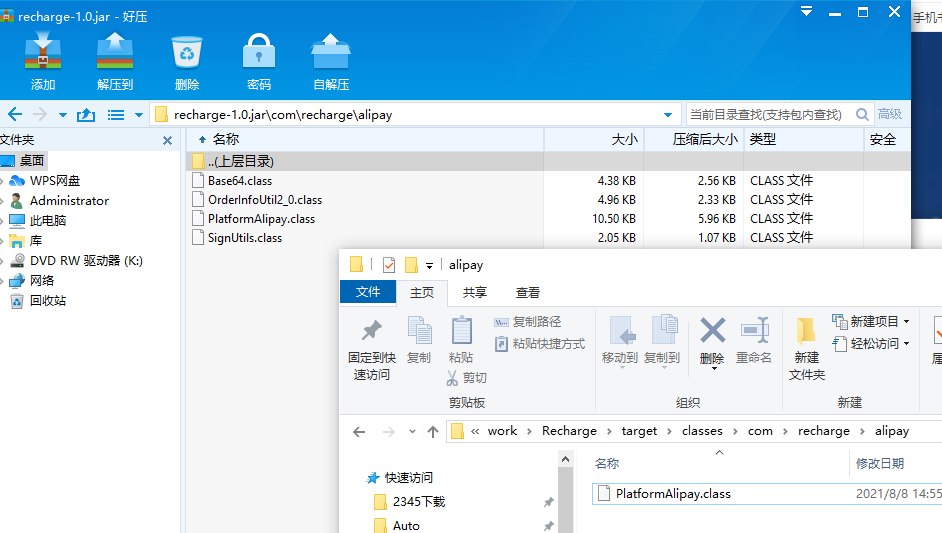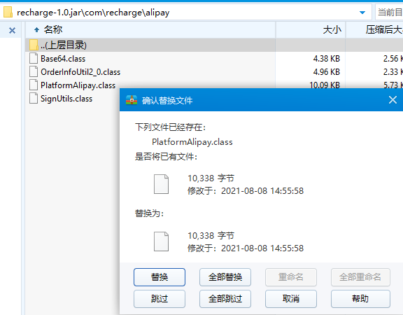 之前写的一个封装了支付宝微信红包、支付的一个jar包,在项目的版本库中没找到源码(可能当时忘记提交了),后面换电脑忘记备份就没有了,现在只能在运行的项目中找到这个jar库。现在要用改一下支付宝的账号和Key,而且这个还是写在java中的常量,只能反编译jar包改了再打包回去了。