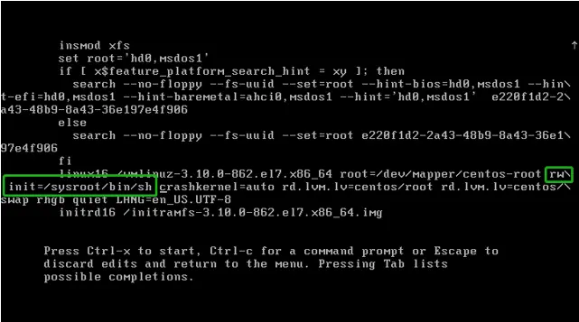 2、按 e。红框中的ro改为:rw init=/sysroot/bin/sh