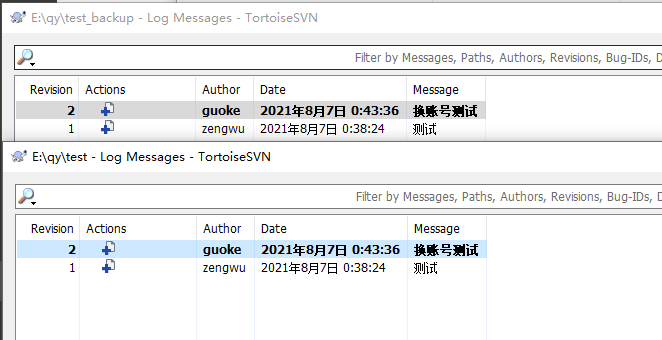 /home/svn/test_backup,因为只作备份,直接使用svn协议:svn://47.97.208.x/test_backup/ - 二台服务都有相同的账号和权限管理文件。账号