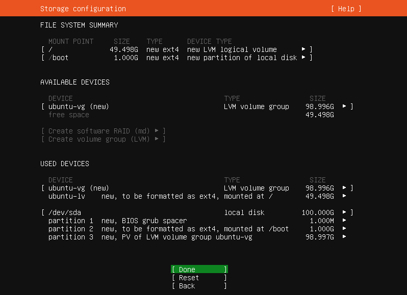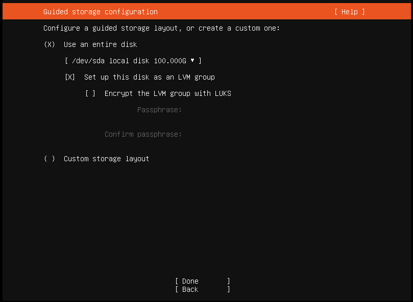默认是Use an entire disk使用整个磁盘,也可以选择Custom storgage layout手动分区。