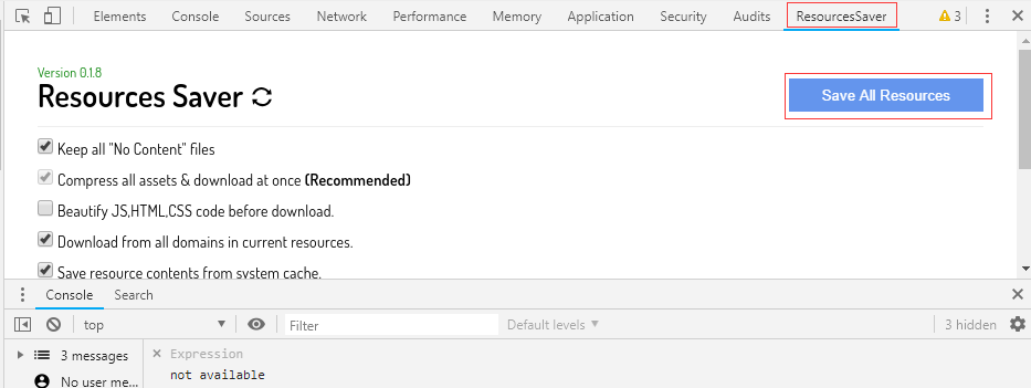打开要下载的网站,按F12查看源码。选择右侧的ResourcesSaver,然后点Save All Resources就可以直接保存