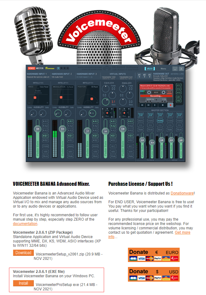 这里推荐voice meeter,官网上有三个版本提供下载,分别是 voicemeeter、voicemeeter banana 和 voicemeeter potato,除了potato 其他两个版本完全免费,可以实现音频多轨道输出了。