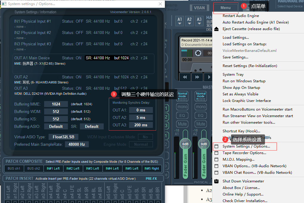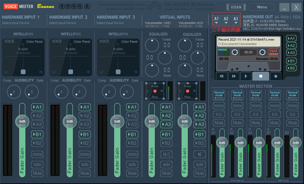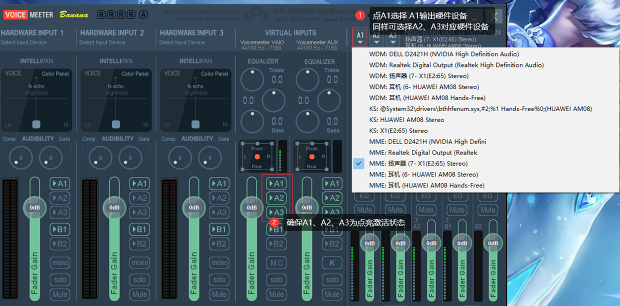 3、 voicemeeterpro默认支持3个硬件音轨输出。点击可以选择输出的硬件设备,选择对应的蓝牙音箱。
