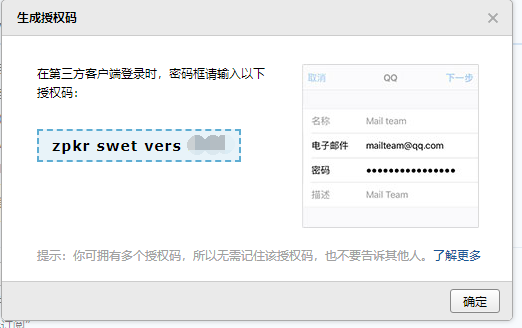 1.2 QQ邮箱不能直接用QQ密码,而是使用 授权码 ,点击 生成授权码