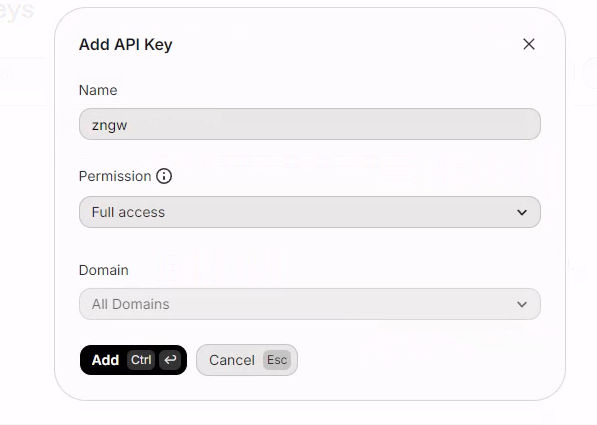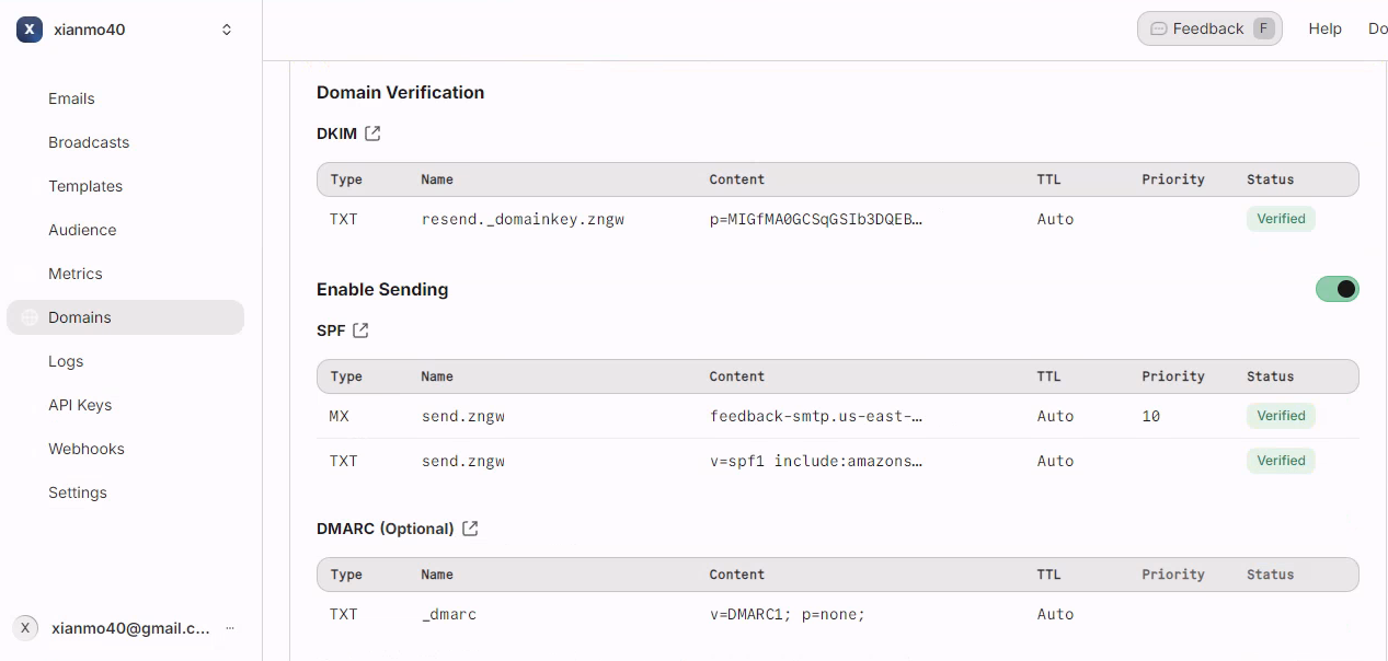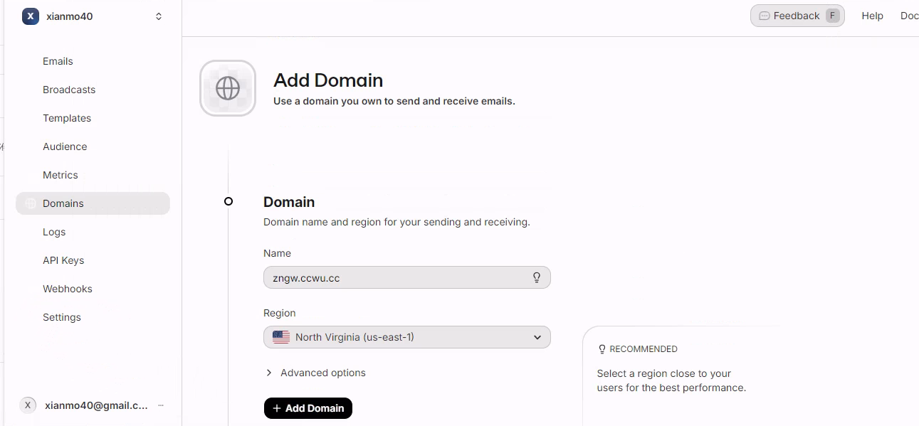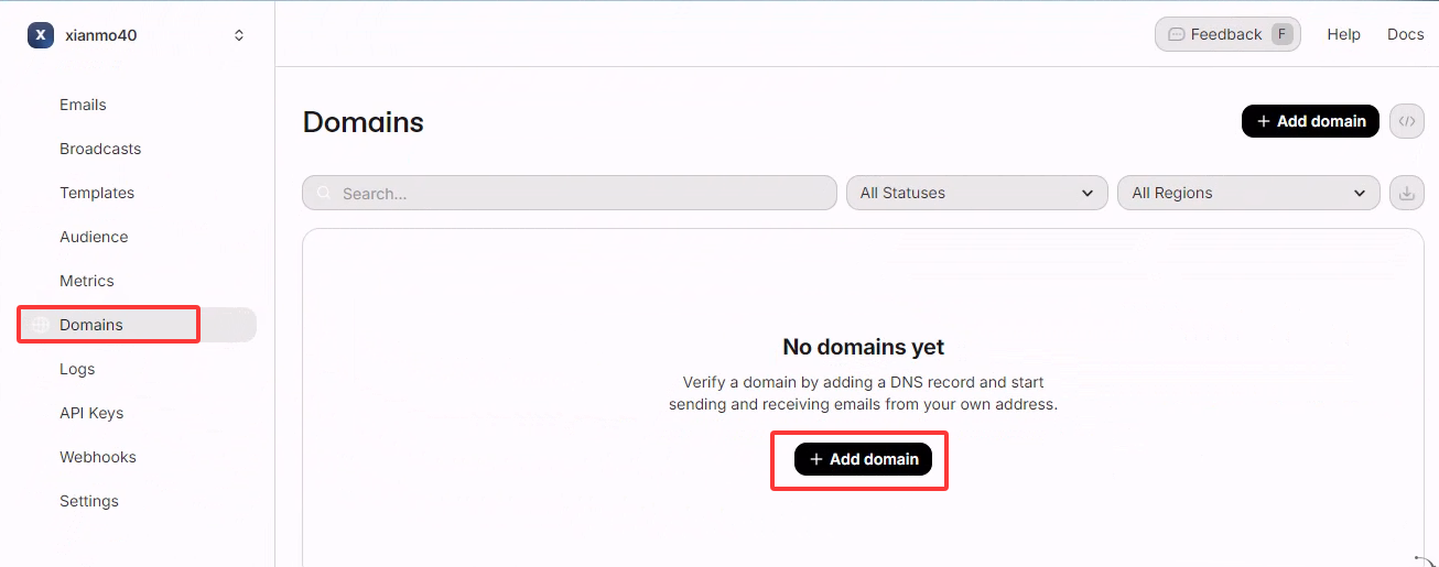 - 注册登录 resend https://resend.com, 切换到 Domains 点加域名