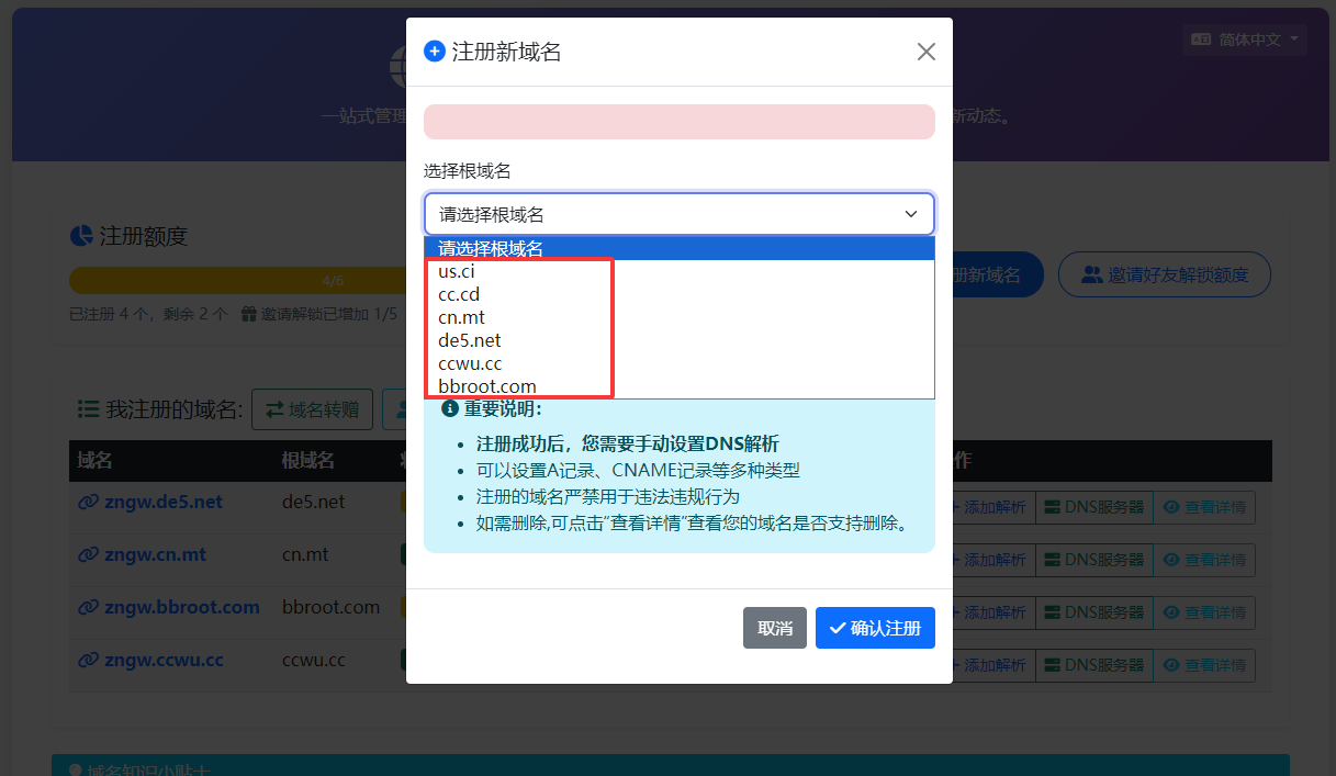 - 进入 免费域名 -> 注册新域名,输入自己的二级域名前缀和选择一个自己喜欢的二级域名