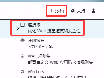 - 注册登录Cloudflarehttps://dash.cloudflare.com,右上角添加 -> 链接域