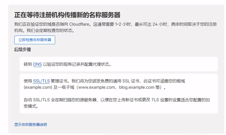 - 回到Cloudflare中,等待DNS服务器生效,一般几分钟到几小时不等