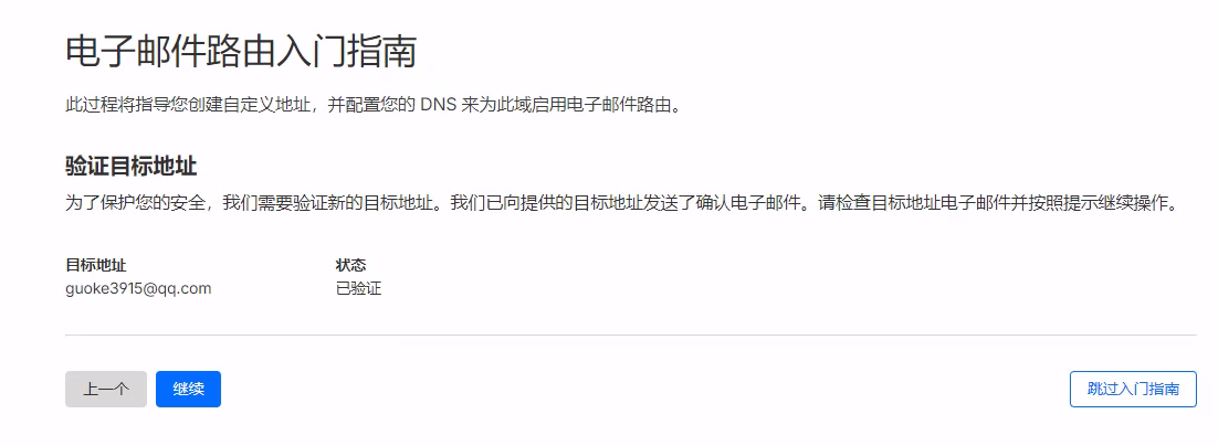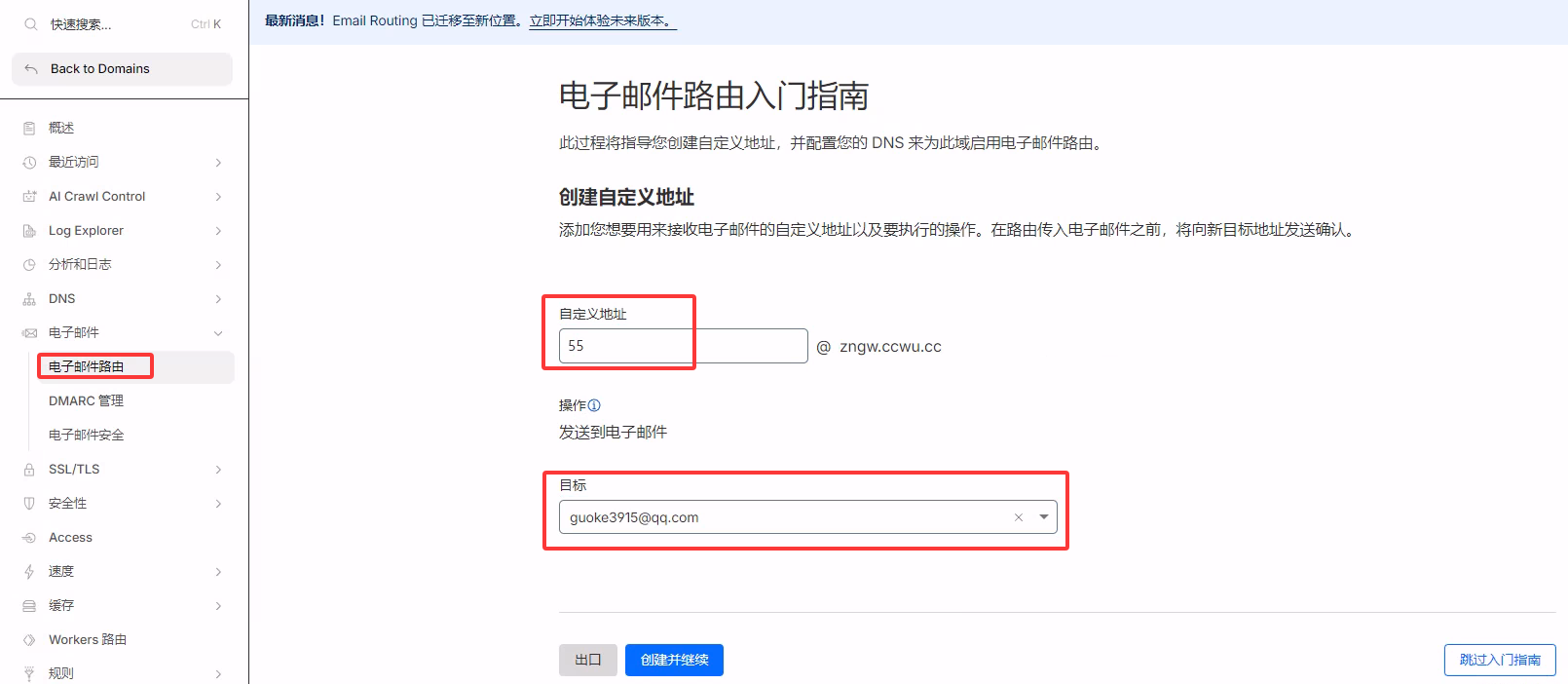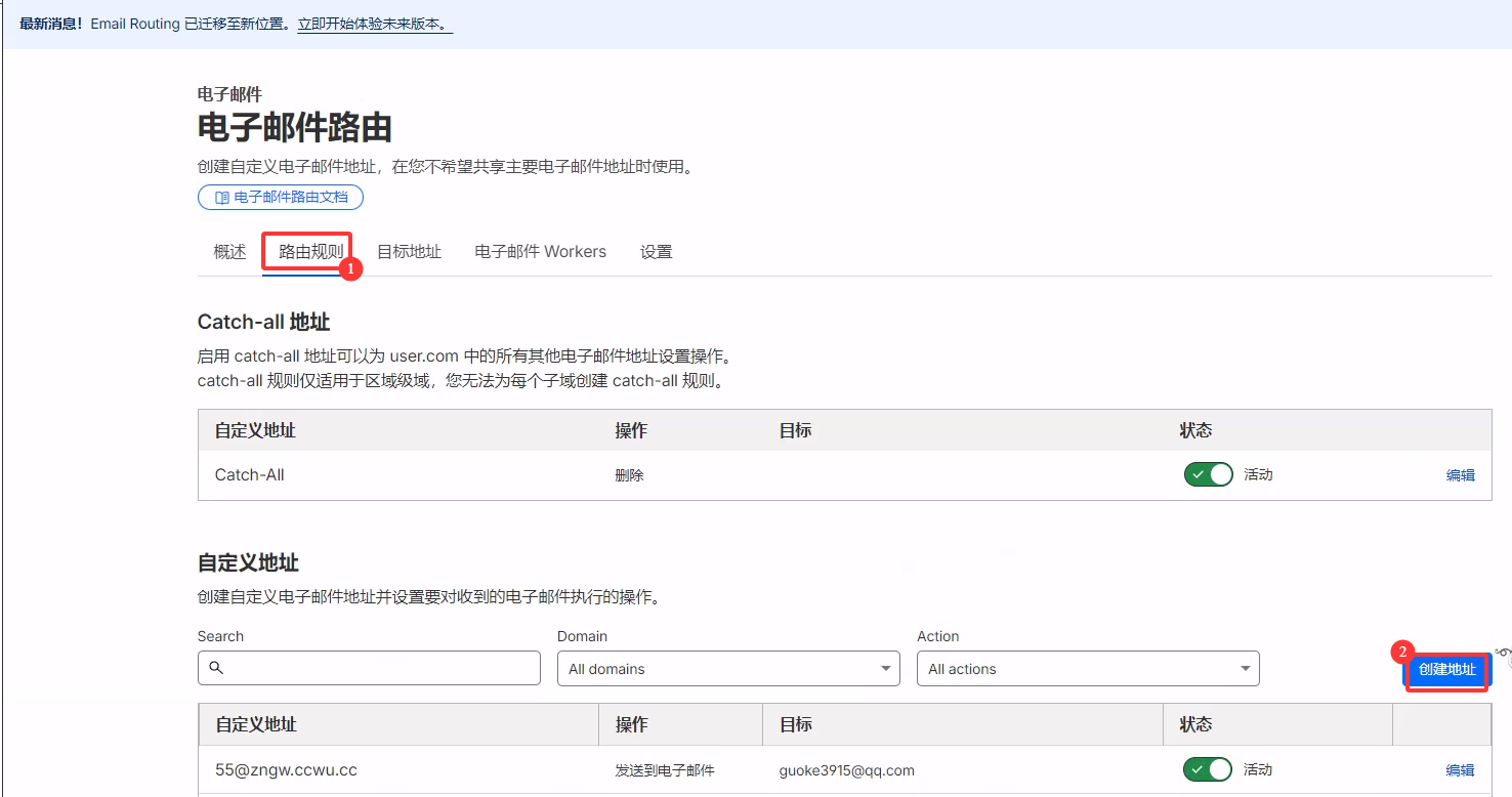 - 进入电子邮件 -> 电子邮件路由 ->创建路由。 自定义地址就是你用的 邮件地址,目标地址是实际接收邮件的地址