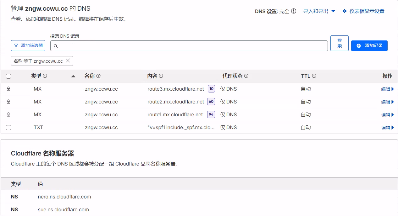 - 复制resend中的几组dns解析,回到Cloudflare中DNS解析页面,添加DNS,等待配置生效