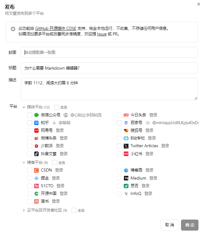 核心功能: Markdown 文档自动即时渲染为微信图文,一键发布多平台,也能直接复制到公众号上发布。