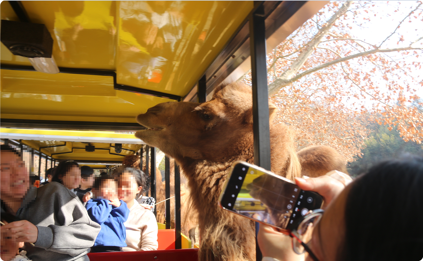 坐上小火车穿越猛兽区时,她突然安静下来,小手紧紧抓着我的手指,眼睛直勾勾盯着窗外的老虎。嘴里含糊不清地喊着:“怕!怕!”。再到后面,一只骆驼头直接伸进了小火车,吓得她直接扑进我怀里差点哭出来。