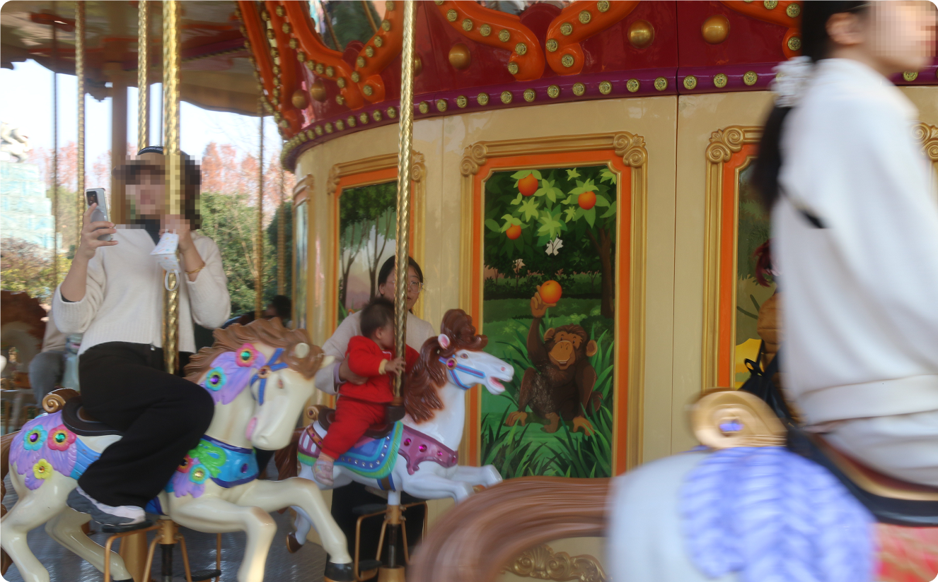 再后面到了“亲子乐园”,这个她能玩的项目不对,基本要求升高1米以上,东转西逛终于找到一个可以玩的项目——旋转木马,估计这也是这个项目最小年龄的游客了吧。