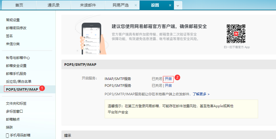 IMAP/SMTP服务进入163邮箱设置页面,选择POP3/SMTP/IMAP,开通IMAP/SMTP服务