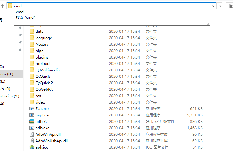 二、在文件资源管理器中进入夜神模拟器的安装目录(默认安装路径为: C:\Program Files\Nox\bin\)