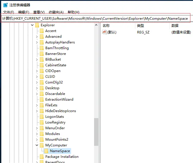 Win+R打开运行窗口,输入regedit打开注册表\HKEY_CURRENT_USER\Software\Microsoft\Windows\CurrentVersion\Explorer\MyComputer\NameSpace