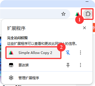 安装后重启浏览器,进入网页,点开右上角的扩展程序,点亮SimpleAllowCopy,使图标成彩色就开启了。然后,网页就和正常网站一样可以直接复制了。