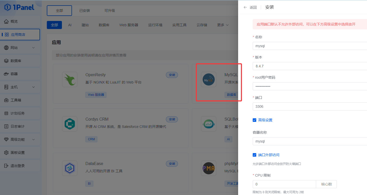 - 进入1Panel后台 -> 应用商店->搜索 MySQL -> 安装。