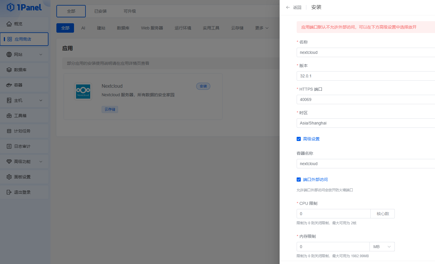 在飞牛OS中,本人比较喜欢用1Panel来管理Docker,下面详细描述使用1Panel面板中安装配置NextCloud。