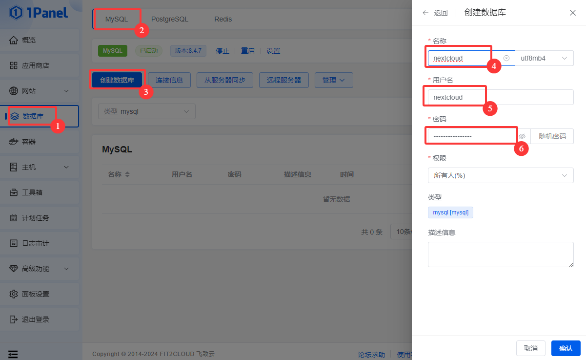 进入 数据库 -> MySQL -> 创建数据库,输入名称、账号、密码。这些记住,后面初始化NextCloud时用