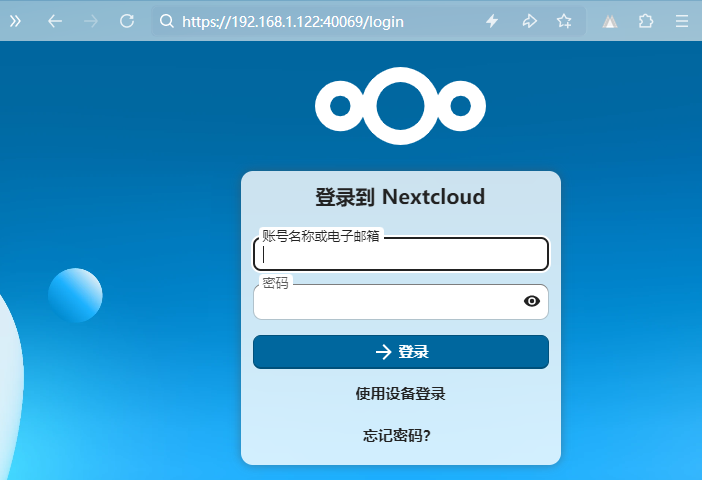 浏览器输入https://ip:40069,并信任证书进入初始化页面。输入管理员账号密码,还有选择需要的数据库地址和密码。这里数据库主机要注意一下,不能用localhost,因为localhost是Docker内的NextCloud本地网络无法连接数据库,这里可以用飞牛OS的IP,也可以用容器中的IP。