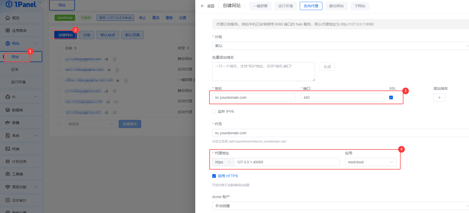 因为NextCloud使用https协议(http协议访问会有安全警告提示出错),可以用Acme给NextCloud做一个SSL自动签名,详细步骤可以参考1Panel管理网站。