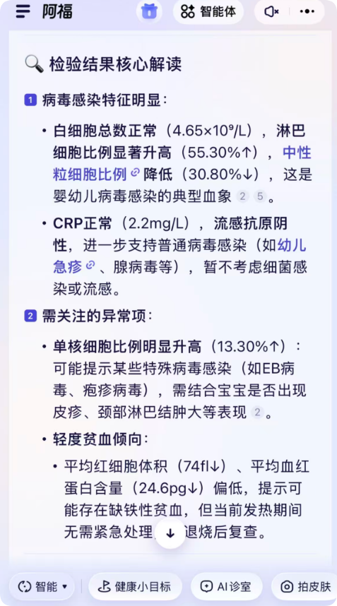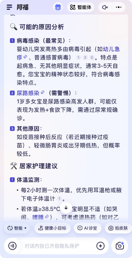 第二天早上起来状态似乎恢复了,以为没事了,结果中午睡了个午觉,体温又起来了,不过这次还好,只是在38.5度,且无明显感冒症状,又是莫名其妙的发烧,这“bug”没完没了了啊。“阿福”建议注意保暖别着凉;少量多次喂水。然后观察,出现以下任一情况需就医: