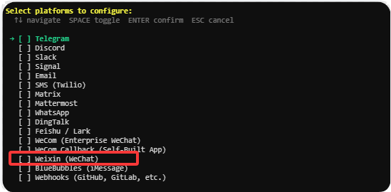 - 配置好模型,就到选择聊天渠道的配置了。现在2026.4.8版本已经支持飞书和微信了,这里直接配置微信