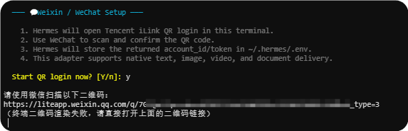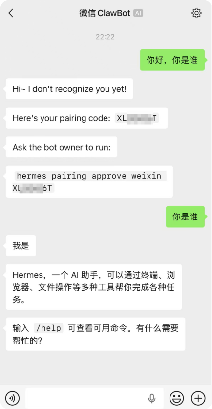 - 到此已经安装完成了,再回到微信,需要配对一下,这个和小龙虾一样,在命令行中输入匹配命令,之后就可以微信控制Hermes了。