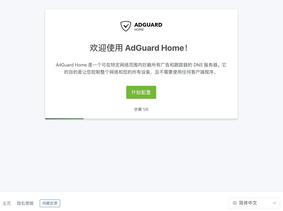 在浏览器中打开 AdGuard Home 的后台,进入安装向导,点击 “开始配置”。默认后台地址为:http://IP:3000/