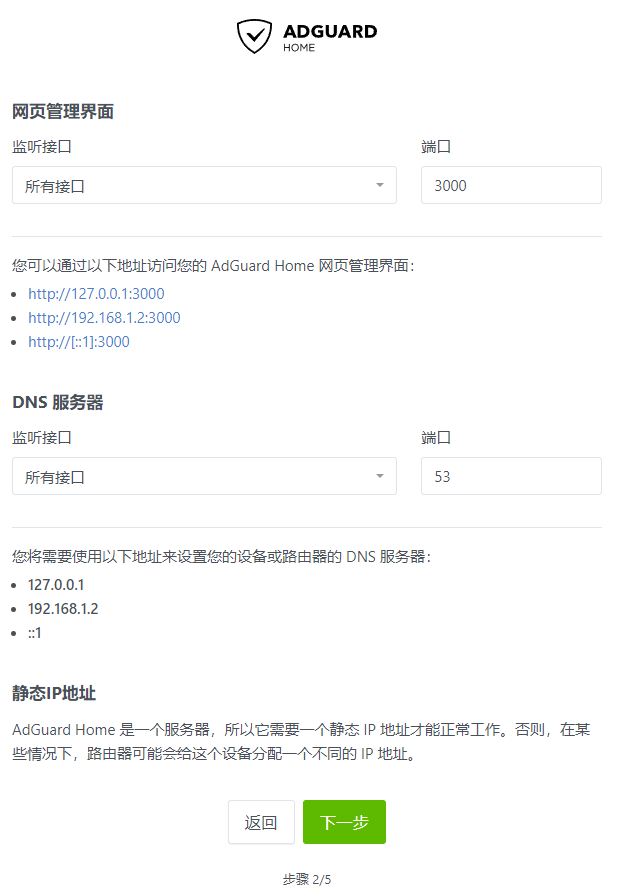 当提示AdGuard Home is successfully installed and will automatically start on boot. 即表示 AdGuard Home 在当前系统上安装成功。在终端上会显示管理后台的地址与端口,默认为 http://IP:3000。