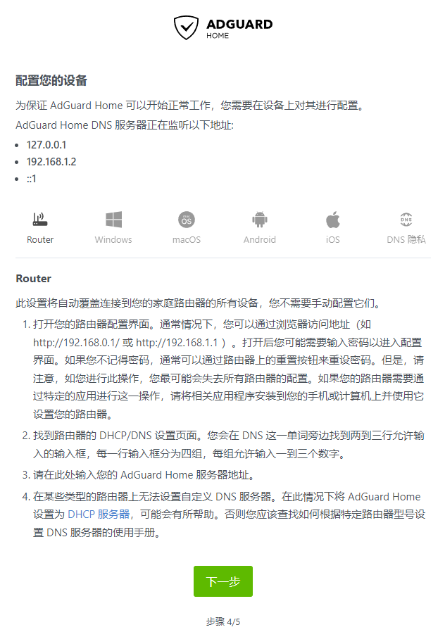 到此,AdGuard Home的基本配置已经完成,接下来可以参考设置指导 http://ip:3000/#guide 来完成路由、电脑等联网设备的DNS修改配置