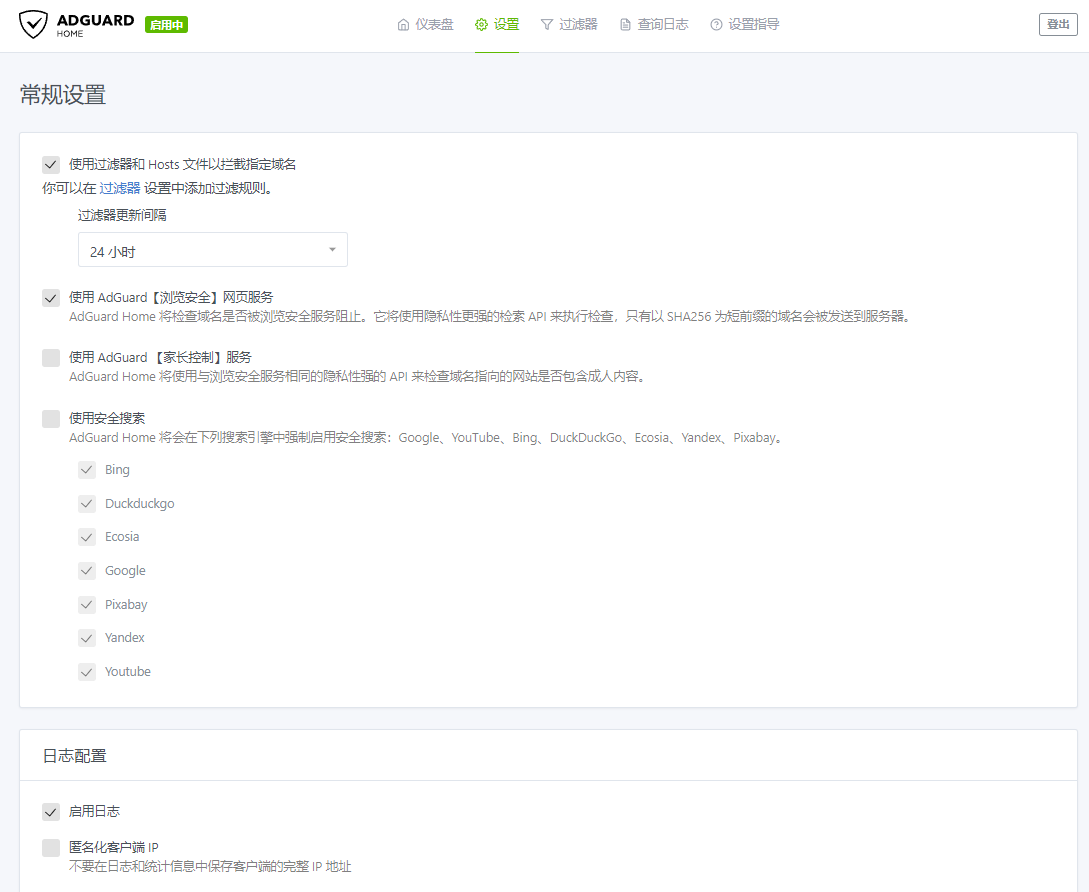 - 查询记录保留时间:AdGuard Home 服务端采用 Sqlite 文件数据库存储日志,长时间保留可能会降低运行速度,同时占用大量的储存空间,家庭用户一般保留 24 小时 - 7 天即可;