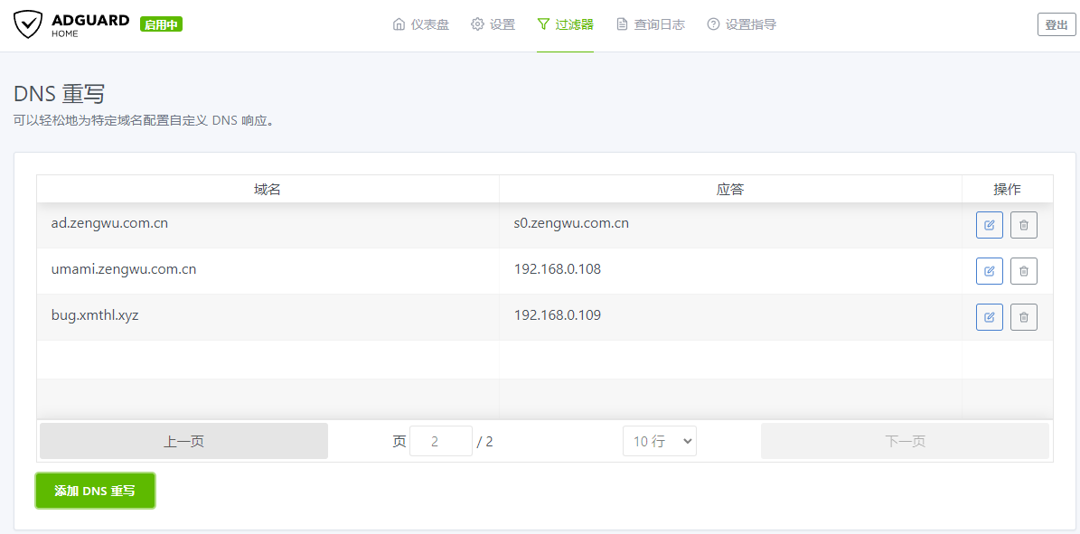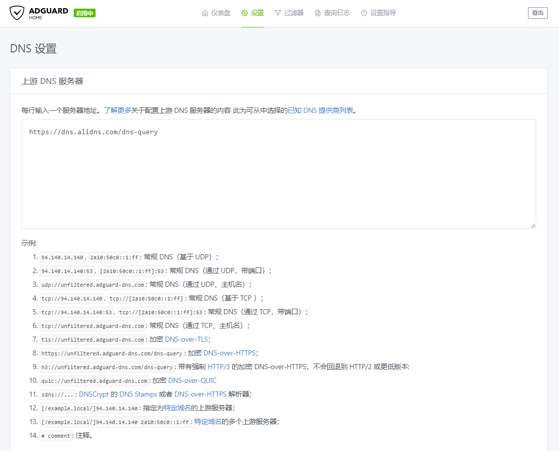 - 上游 DNS 服务器:AdGuard Home 的上游 DNS 服务器,可参考下方推荐列表,一般保留 1 - 2 个即可。AdGuard Home 除了可以作为广告过滤网关,如果设置了纯净 DNS 后,还可以避免运营商的 DNS 劫持。