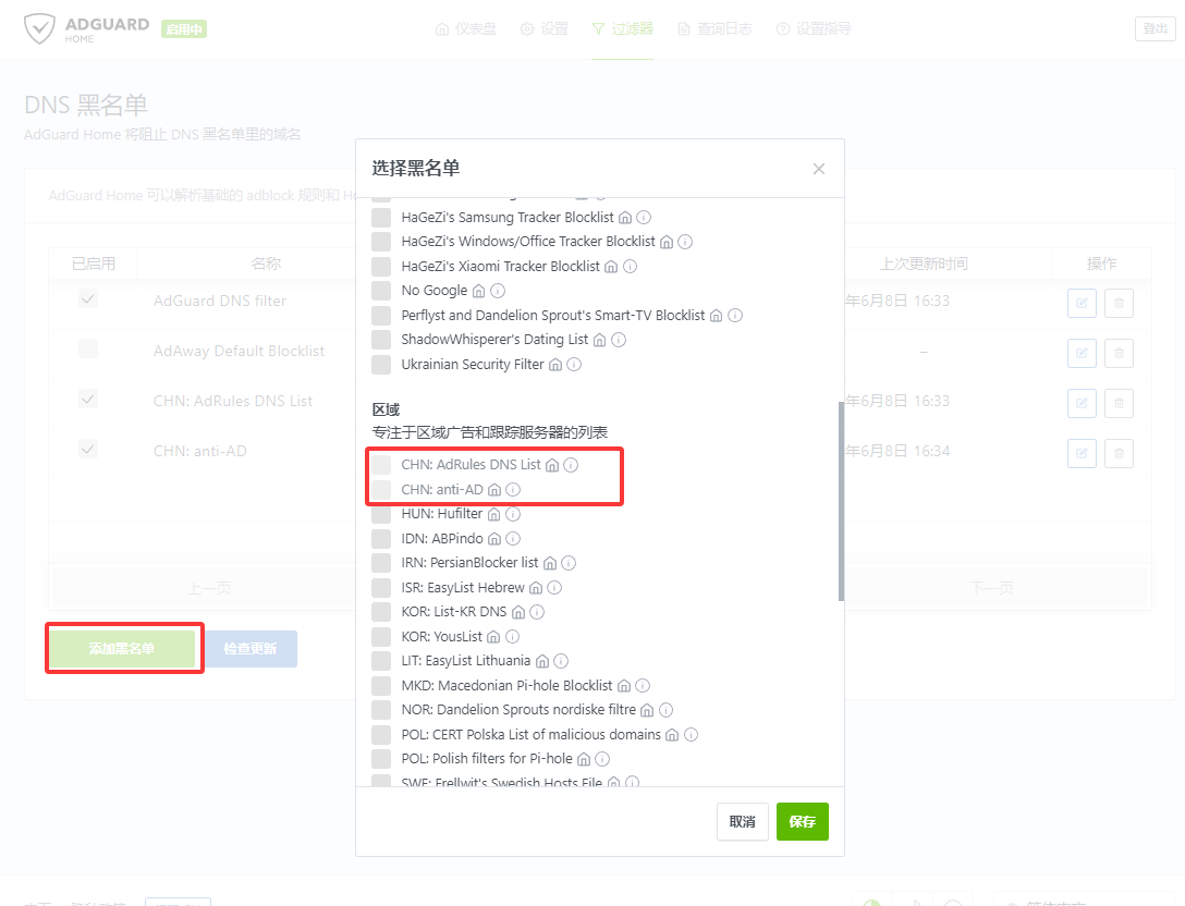 为了更好地发挥 AdGuard Home 去广告的功能,仅依靠默认的过滤规则是不够的,但也不宜过多,过多的过滤规则会影响解析的速度,各位可以根据需要添加过滤规则。添加黑名单->从列表中选择 在列表中选择需要的