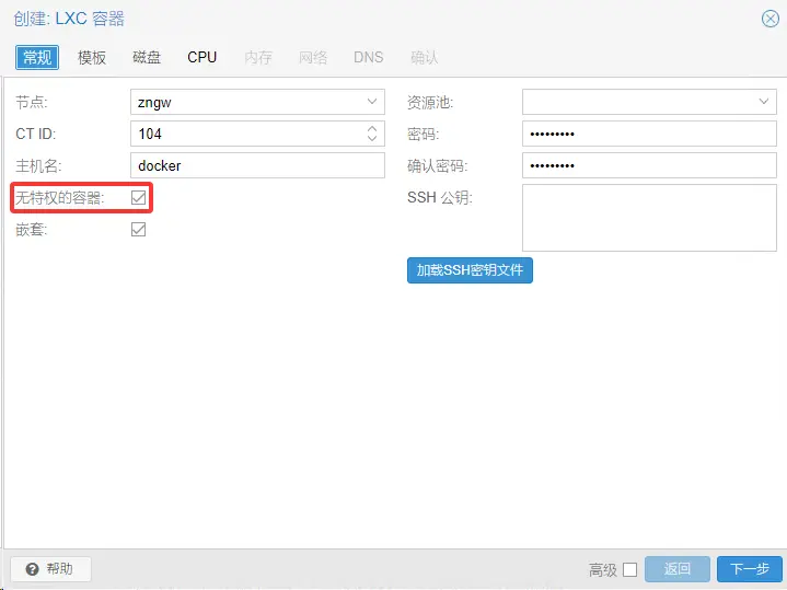 需要取消无特权的容器后面的勾选,不然docker权限受限会有问题