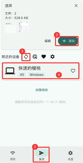 - 在iPhone 手机端切换到发送选项,添加需要发送的文件,这里可以多选。再点附近设备刷新,就可以看到电脑设备了。