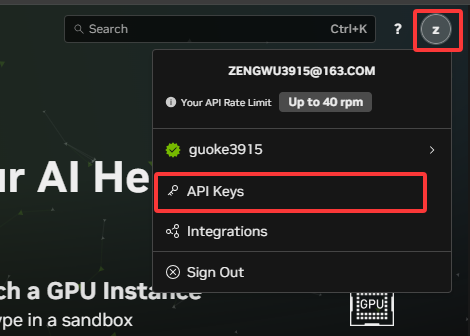 - 然后回到主机,点右上角自己头像,在弹出的弹窗中选择 API Keys