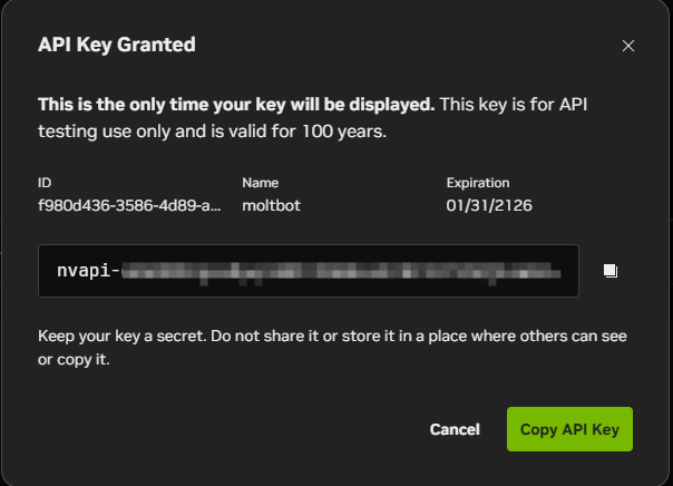 - 这样Key创建完成了,会显示Key,以**nvapi-**开头的字符串,这个只显示一次,复制保存,后面会用到。