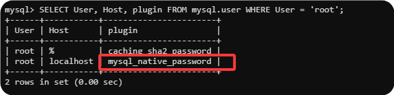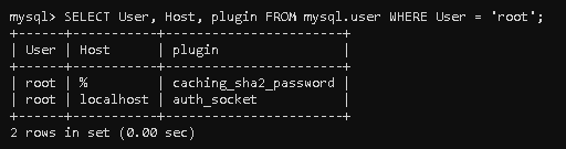 SELECT User, Host, plugin FROM mysql.user WHERE User = 'root';会看到root@localhost为